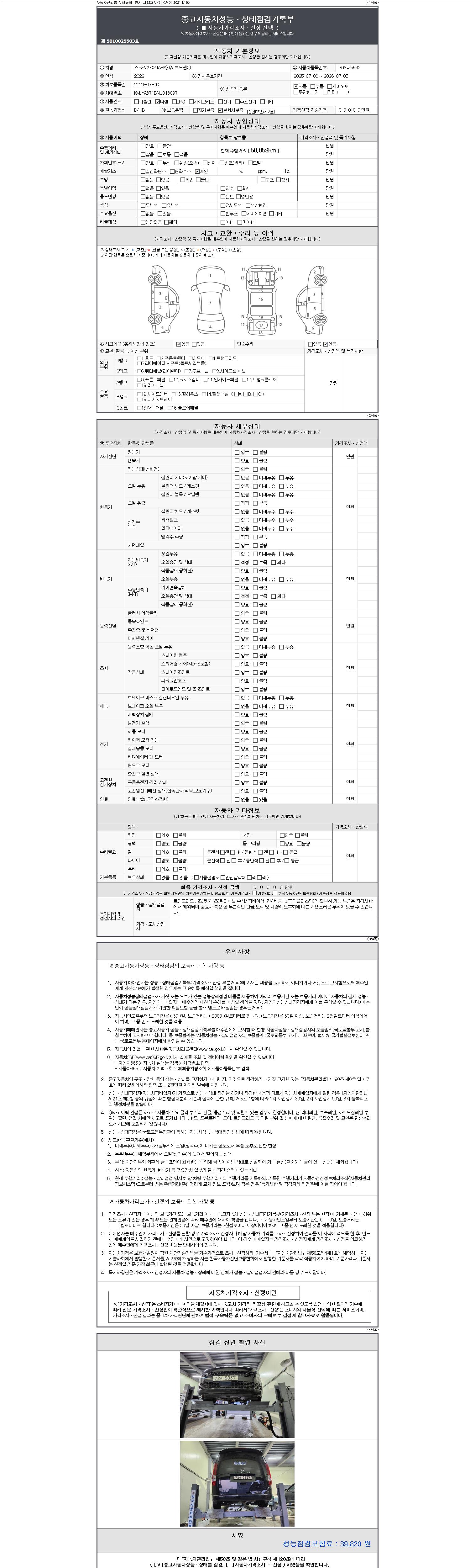 자동차관리법 시행규칙 제120조의 규정에 따라 별지 제 82호서식 《중고자동차 성능, 상태점검 기록부》를 발행한 성능, 상태점검자 및 매매자는 아래의 보증기간 또는 보증거리 이내의 중고자동차, 성능점검 기록부에 기재된 내용과 자동차의 실제 성능, 상태가 다른 경우 계약 또는 관계법령에 따라 매수인에 대하여 책임을 집니다.