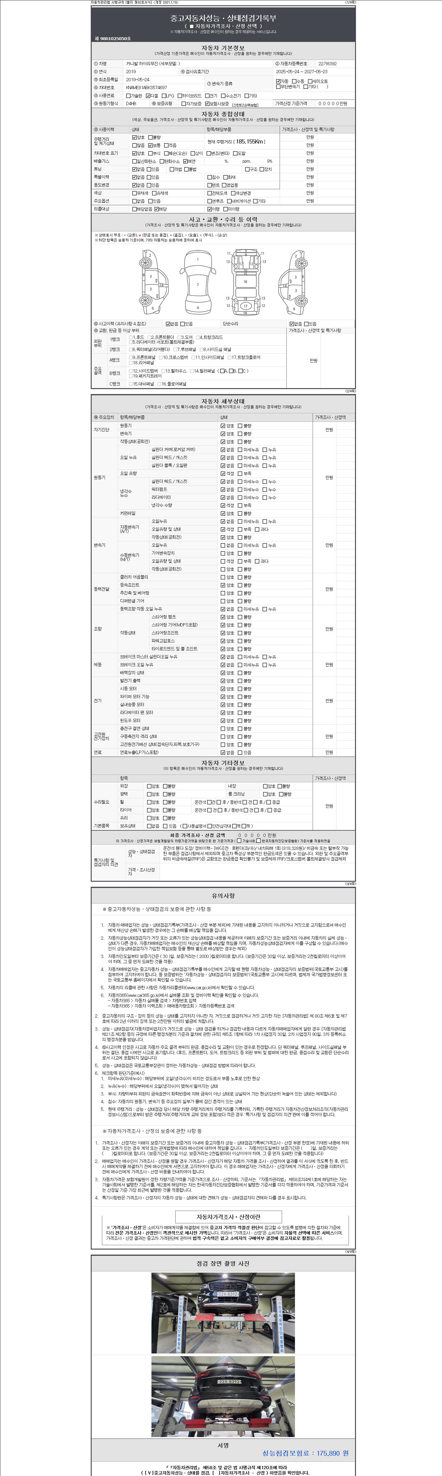 자동차관리법 시행규칙 제120조의 규정에 따라 별지 제 82호서식 《중고자동차 성능, 상태점검 기록부》를 발행한 성능, 상태점검자 및 매매자는 아래의 보증기간 또는 보증거리 이내의 중고자동차, 성능점검 기록부에 기재된 내용과 자동차의 실제 성능, 상태가 다른 경우 계약 또는 관계법령에 따라 매수인에 대하여 책임을 집니다.
