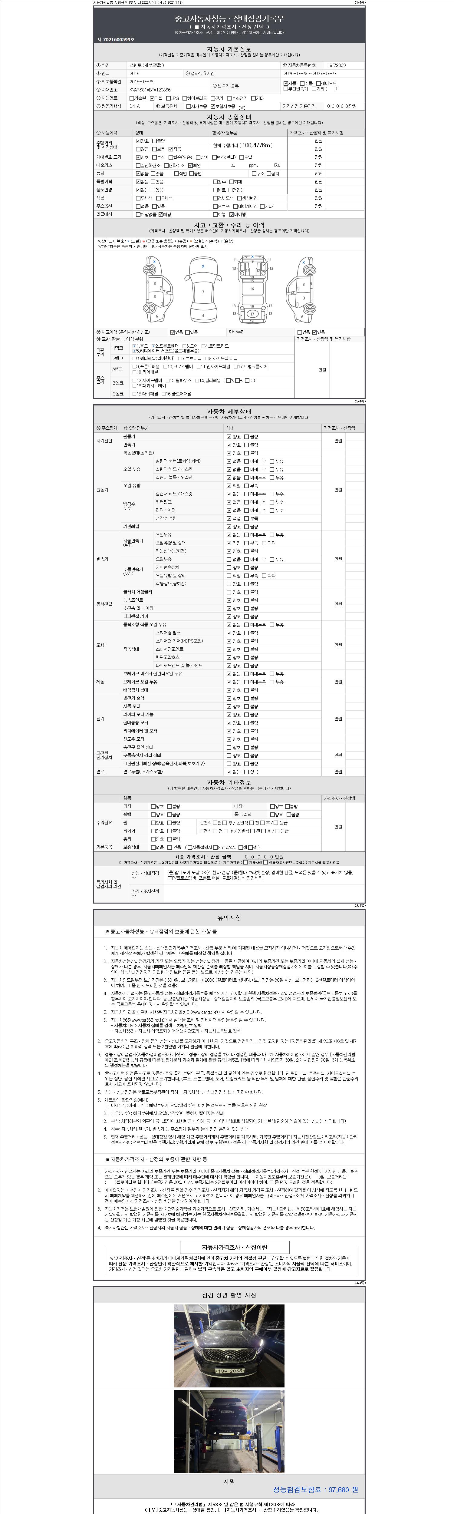 -중고자동차 매매업자를 통해 차량을 구입하실 경우 반드시 "중고자동차 성능, 상태점검 기록부"를 교뷰 받으셔야 하며, 매매업자는 반드시 의무 교부 하여야 압니다.