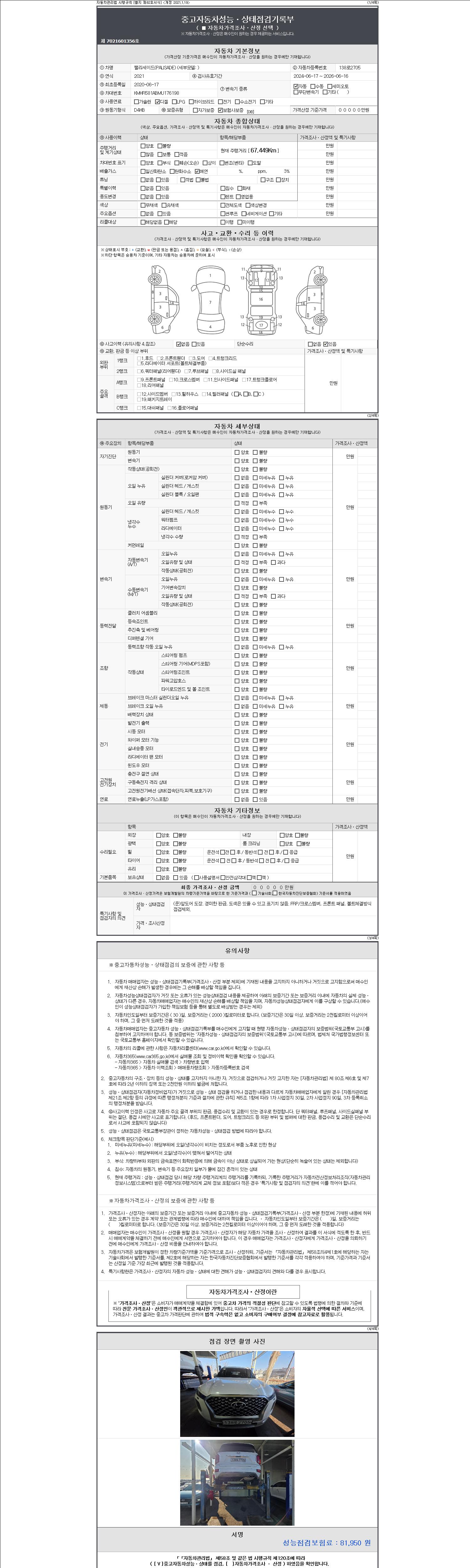 자동차관리법 시행규칙 제120조의 규정에 따라 별지 제 82호서식 《중고자동차 성능, 상태점검 기록부》를 발행한 성능, 상태점검자 및 매매자는 아래의 보증기간 또는 보증거리 이내의 중고자동차, 성능점검 기록부에 기재된 내용과 자동차의 실제 성능, 상태가 다른 경우 계약 또는 관계법령에 따라 매수인에 대하여 책임을 집니다.