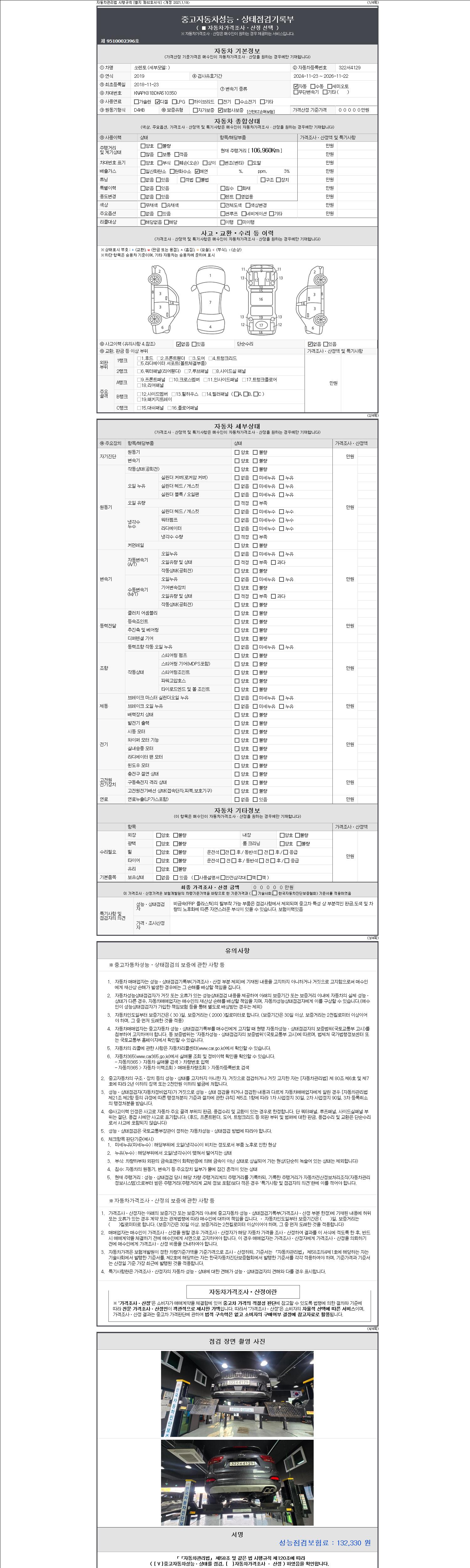 자동차관리법 시행규칙 제120조의 규정에 따라 별지 제 82호서식 《중고자동차 성능, 상태점검 기록부》를 발행한 성능, 상태점검자 및 매매자는 아래의 보증기간 또는 보증거리 이내의 중고자동차, 성능점검 기록부에 기재된 내용과 자동차의 실제 성능, 상태가 다른 경우 계약 또는 관계법령에 따라 매수인에 대하여 책임을 집니다.