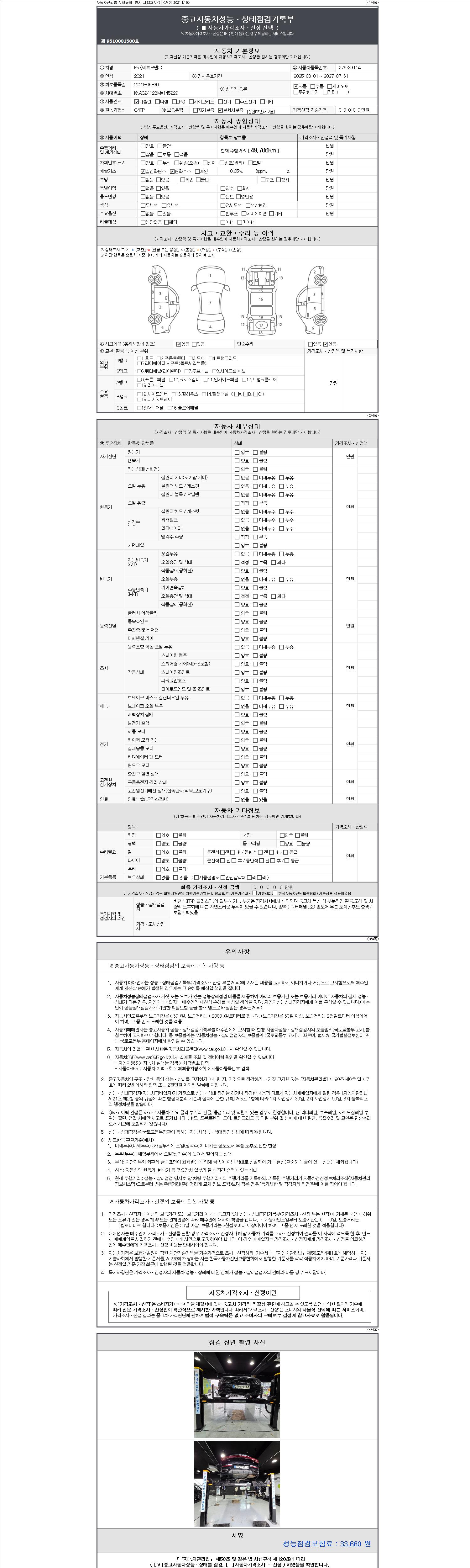 자동차관리법 시행규칙 제120조의 규정에 따라 별지 제 82호서식 《중고자동차 성능, 상태점검 기록부》를 발행한 성능, 상태점검자 및 매매자는 아래의 보증기간 또는 보증거리 이내의 중고자동차, 성능점검 기록부에 기재된 내용과 자동차의 실제 성능, 상태가 다른 경우 계약 또는 관계법령에 따라 매수인에 대하여 책임을 집니다.