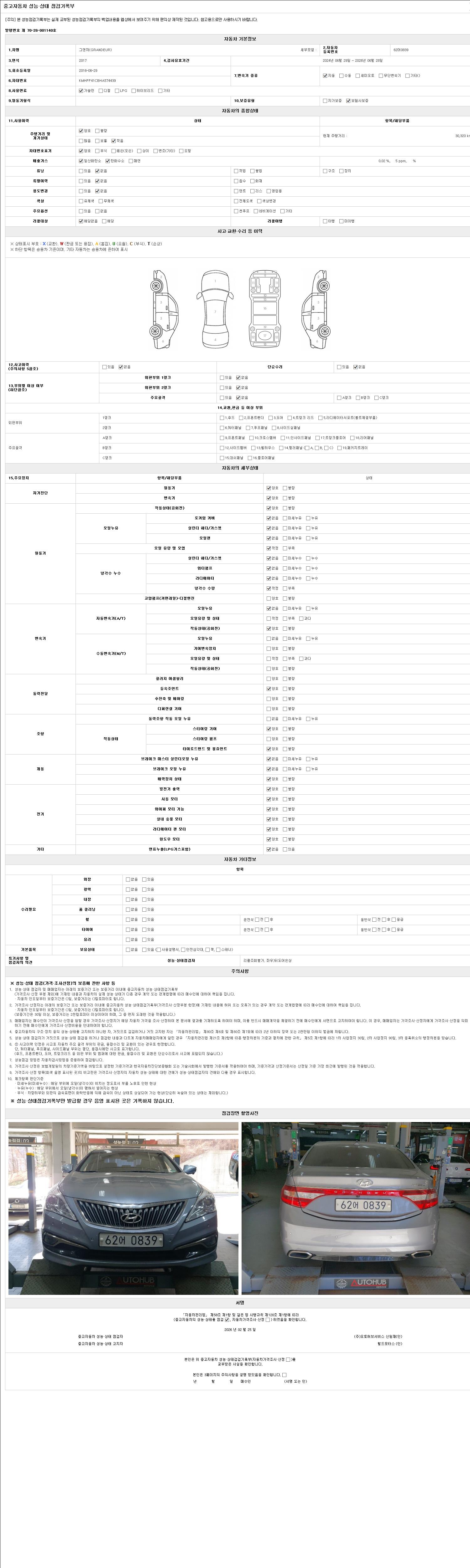 자동차관리법 시행규칙 제120조의 규정에 따라 별지 제 82호서식 《중고자동차 성능, 상태점검 기록부》를 발행한 성능, 상태점검자 및 매매자는 아래의 보증기간 또는 보증거리 이내의 중고자동차, 성능점검 기록부에 기재된 내용과 자동차의 실제 성능, 상태가 다른 경우 계약 또는 관계법령에 따라 매수인에 대하여 책임을 집니다.