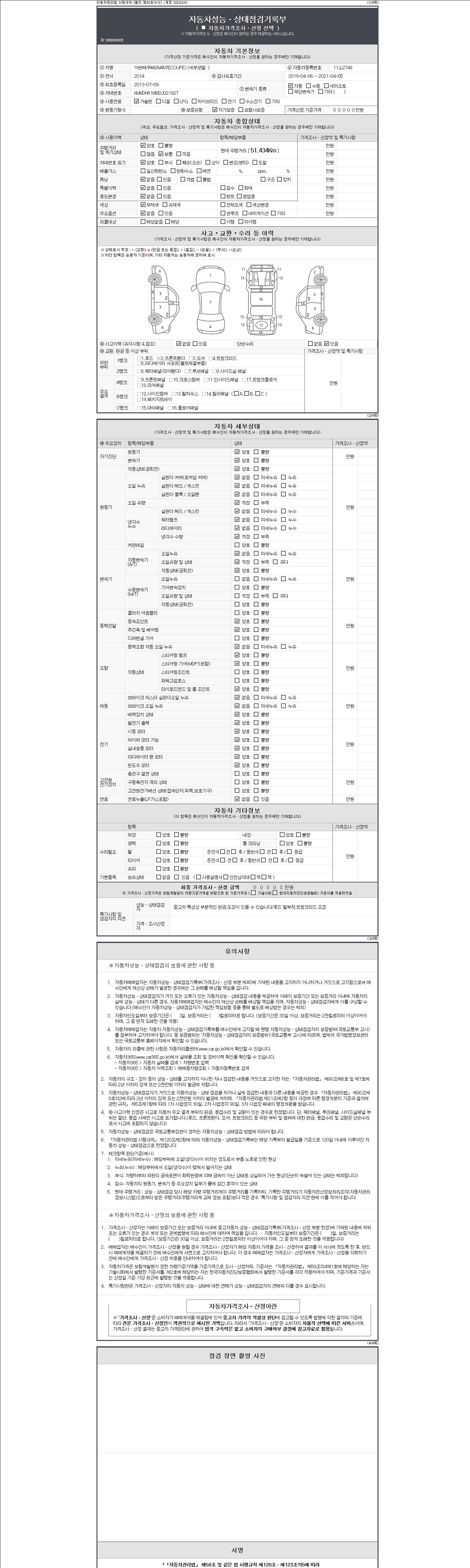 -중고자동차 매매업자를 통해 차량을 구입하실 경우 반드시 "중고자동차 성능, 상태점검 기록부"를 교뷰 받으셔야 하며, 매매업자는 반드시 의무 교부 하여야 압니다.