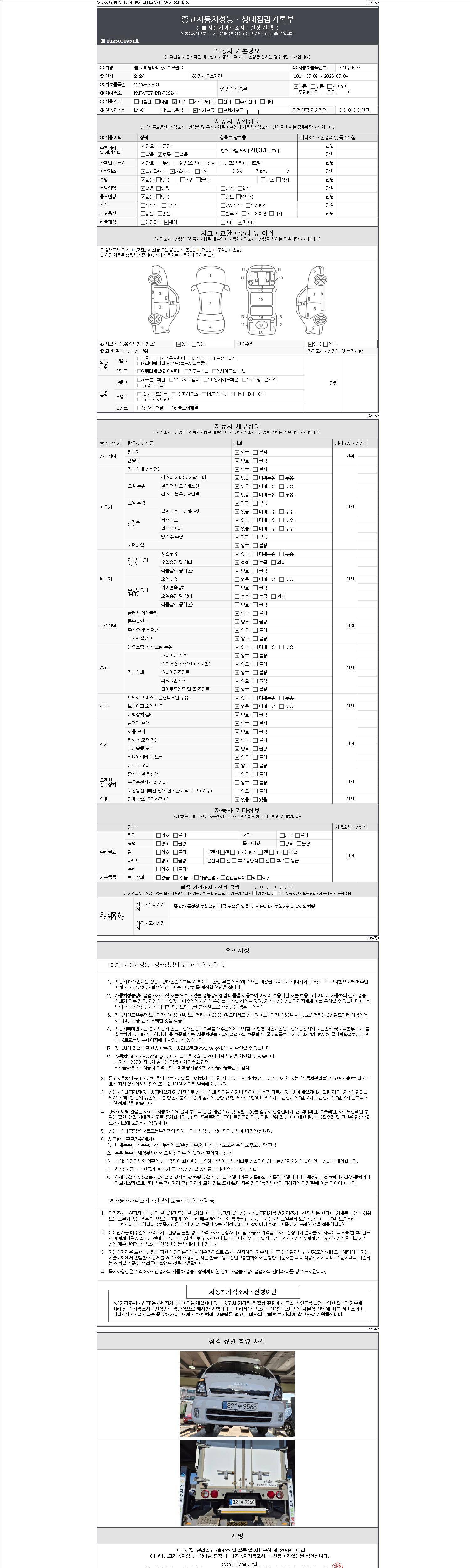 자동차관리법 시행규칙 제120조의 규정에 따라 별지 제 82호서식 《중고자동차 성능, 상태점검 기록부》를 발행한 성능, 상태점검자 및 매매자는 아래의 보증기간 또는 보증거리 이내의 중고자동차, 성능점검 기록부에 기재된 내용과 자동차의 실제 성능, 상태가 다른 경우 계약 또는 관계법령에 따라 매수인에 대하여 책임을 집니다.
