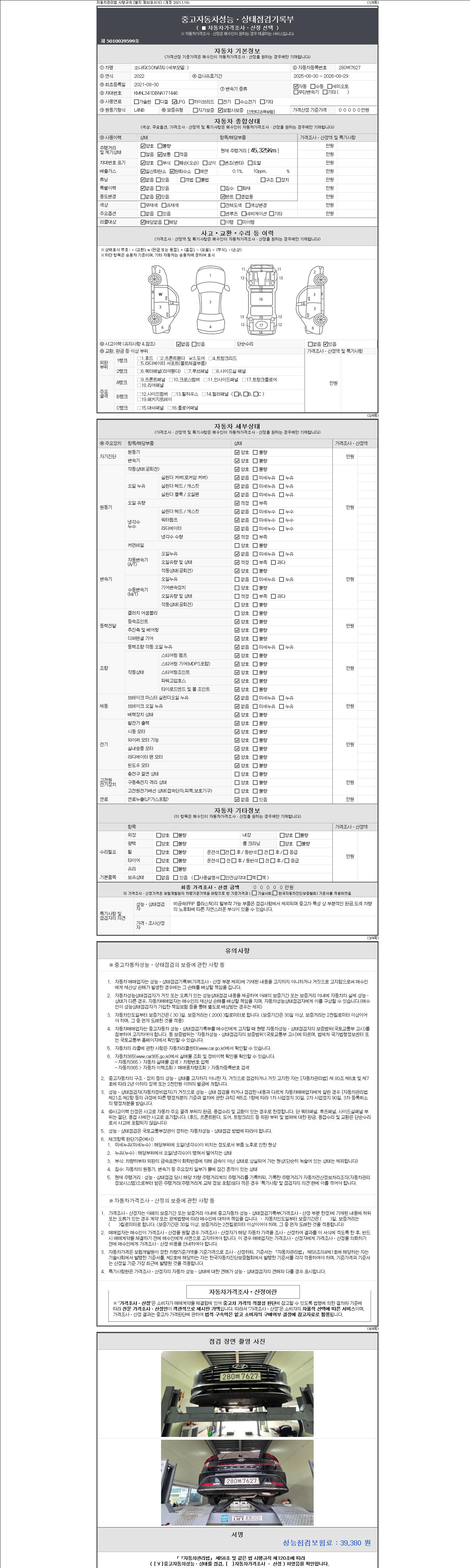 자동차관리법 시행규칙 제120조의 규정에 따라 별지 제 82호서식 《중고자동차 성능, 상태점검 기록부》를 발행한 성능, 상태점검자 및 매매자는 아래의 보증기간 또는 보증거리 이내의 중고자동차, 성능점검 기록부에 기재된 내용과 자동차의 실제 성능, 상태가 다른 경우 계약 또는 관계법령에 따라 매수인에 대하여 책임을 집니다.
