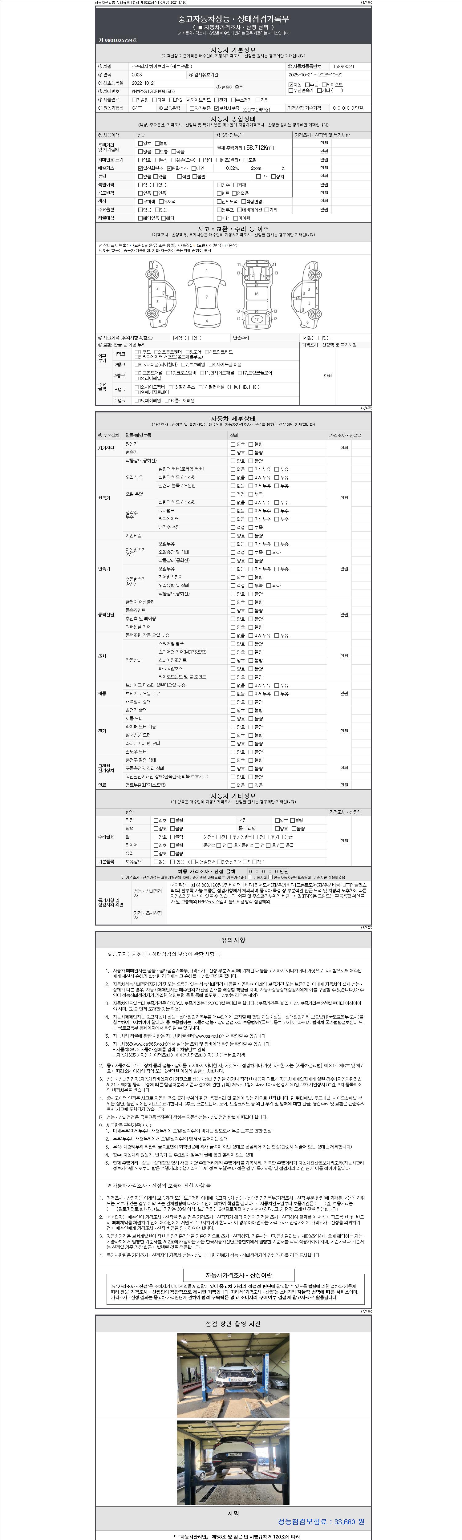 자동차관리법 시행규칙 제120조의 규정에 따라 별지 제 82호서식 《중고자동차 성능, 상태점검 기록부》를 발행한 성능, 상태점검자 및 매매자는 아래의 보증기간 또는 보증거리 이내의 중고자동차, 성능점검 기록부에 기재된 내용과 자동차의 실제 성능, 상태가 다른 경우 계약 또는 관계법령에 따라 매수인에 대하여 책임을 집니다.