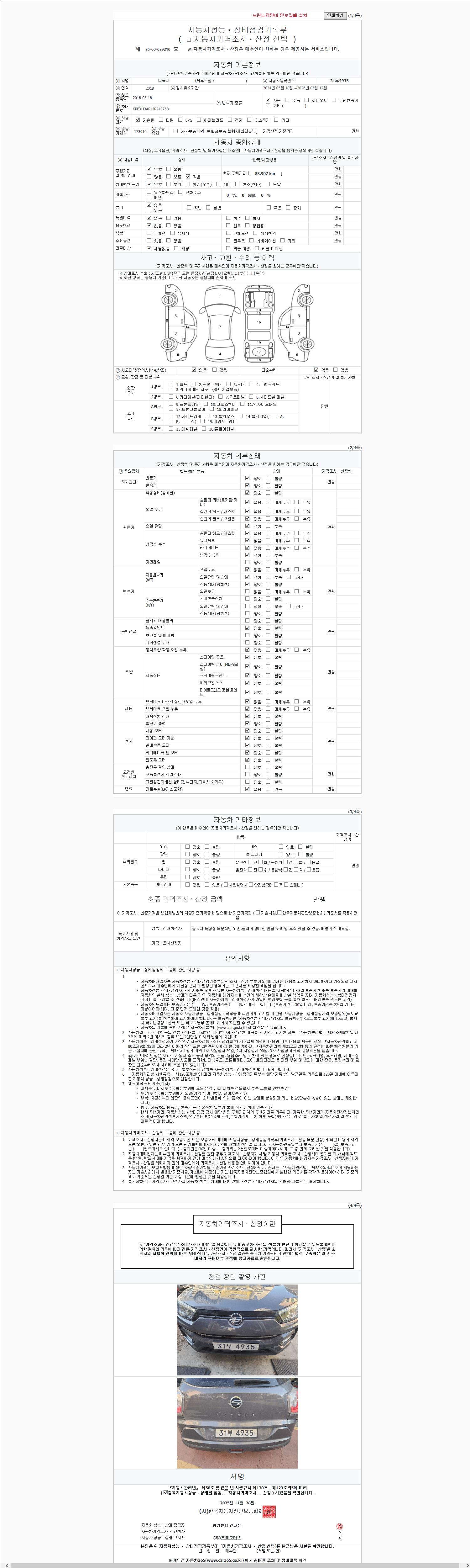 | 주행거리 | 83,902 km | 차량번호 | 31부4935 |