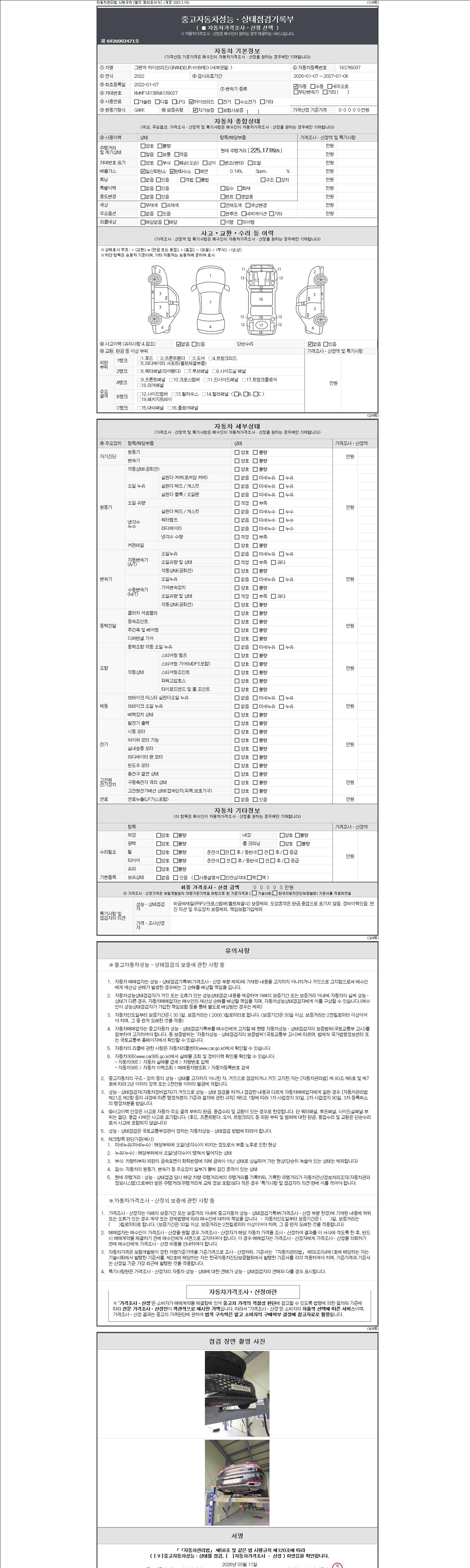 자동차관리법 시행규칙 제120조의 규정에 따라 별지 제 82호서식 《중고자동차 성능, 상태점검 기록부》를 발행한 성능, 상태점검자 및 매매자는 아래의 보증기간 또는 보증거리 이내의 중고자동차, 성능점검 기록부에 기재된 내용과 자동차의 실제 성능, 상태가 다른 경우 계약 또는 관계법령에 따라 매수인에 대하여 책임을 집니다.