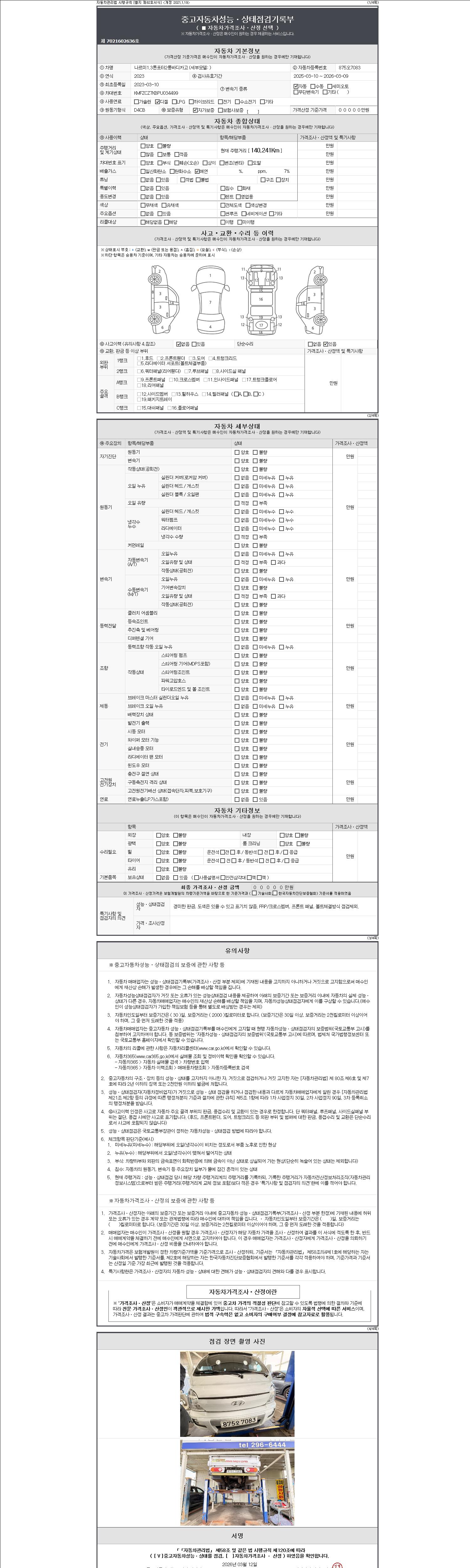 자동차관리법 시행규칙 제120조의 규정에 따라 별지 제 82호서식 《중고자동차 성능, 상태점검 기록부》를 발행한 성능, 상태점검자 및 매매자는 아래의 보증기간 또는 보증거리 이내의 중고자동차, 성능점검 기록부에 기재된 내용과 자동차의 실제 성능, 상태가 다른 경우 계약 또는 관계법령에 따라 매수인에 대하여 책임을 집니다.