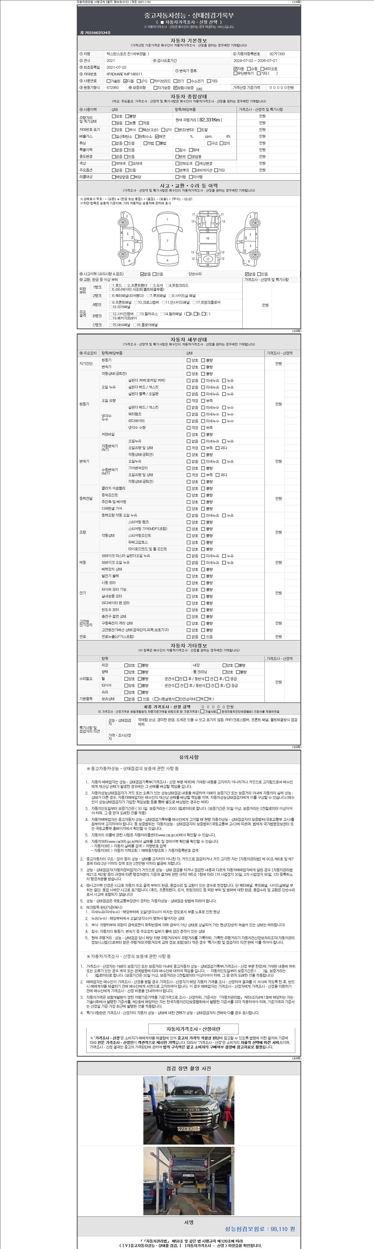 자동차관리법 시행규칙 제120조의 규정에 따라 별지 제 82호서식 《중고자동차 성능, 상태점검 기록부》를 발행한 성능, 상태점검자 및 매매자는 아래의 보증기간 또는 보증거리 이내의 중고자동차, 성능점검 기록부에 기재된 내용과 자동차의 실제 성능, 상태가 다른 경우 계약 또는 관계법령에 따라 매수인에 대하여 책임을 집니다.