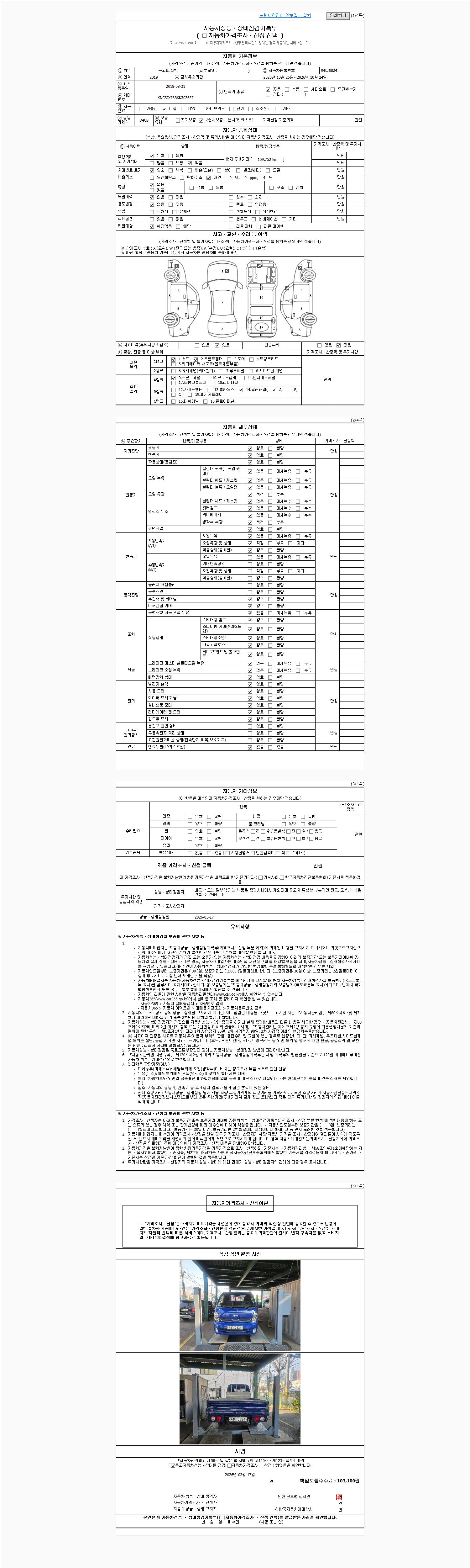자동차관리법 시행규칙 제120조의 규정에 따라 별지 제 82호서식 《중고자동차 성능, 상태점검 기록부》를 발행한 성능, 상태점검자 및 매매자는 아래의 보증기간 또는 보증거리 이내의 중고자동차, 성능점검 기록부에 기재된 내용과 자동차의 실제 성능, 상태가 다른 경우 계약 또는 관계법령에 따라 매수인에 대하여 책임을 집니다.
