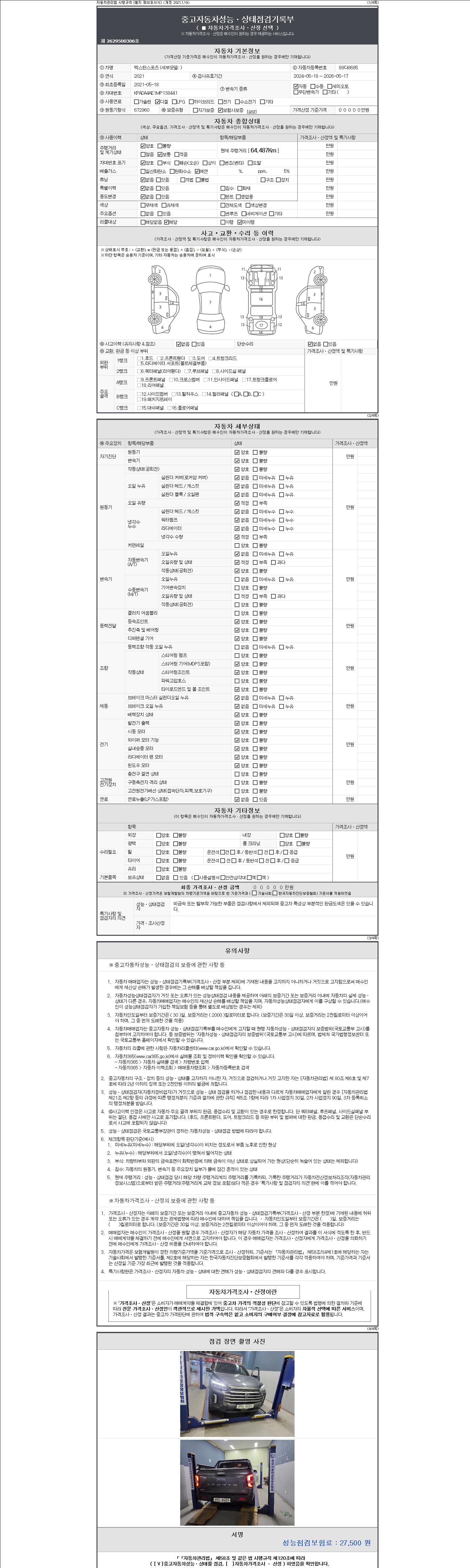 자동차관리법 시행규칙 제120조의 규정에 따라 별지 제 82호서식 《중고자동차 성능, 상태점검 기록부》를 발행한 성능, 상태점검자 및 매매자는 아래의 보증기간 또는 보증거리 이내의 중고자동차, 성능점검 기록부에 기재된 내용과 자동차의 실제 성능, 상태가 다른 경우 계약 또는 관계법령에 따라 매수인에 대하여 책임을 집니다.