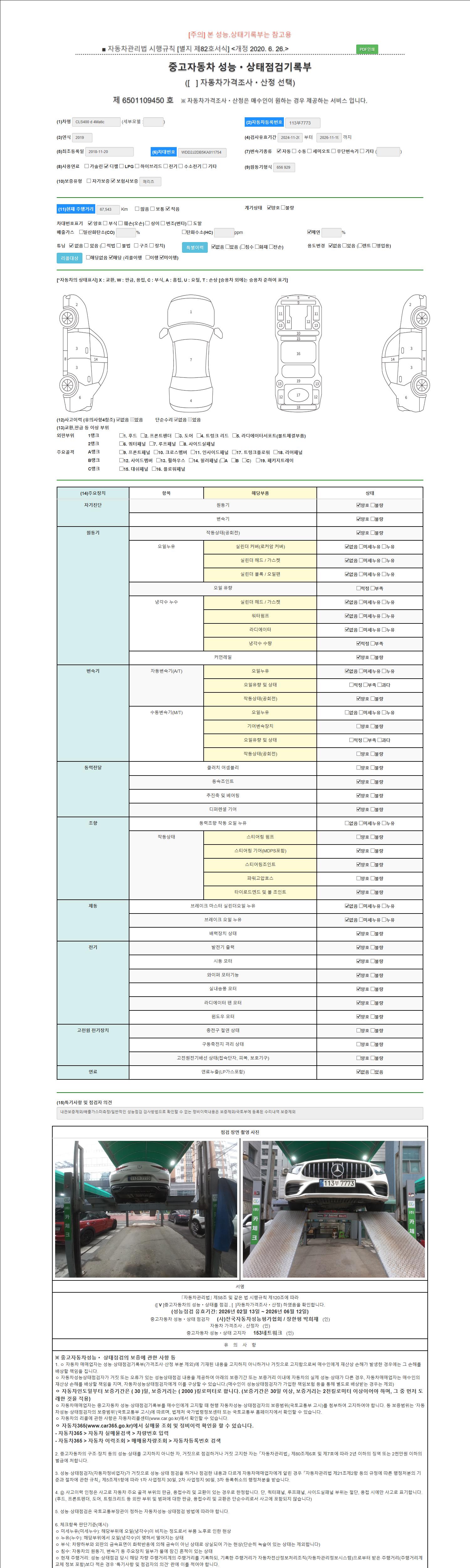 자동차관리법 시행규칙 제120조의 규정에 따라 별지 제 82호서식 《중고자동차 성능, 상태점검 기록부》를 발행한 성능, 상태점검자 및 매매자는 아래의 보증기간 또는 보증거리 이내의 중고자동차, 성능점검 기록부에 기재된 내용과 자동차의 실제 성능, 상태가 다른 경우 계약 또는 관계법령에 따라 매수인에 대하여 책임을 집니다.