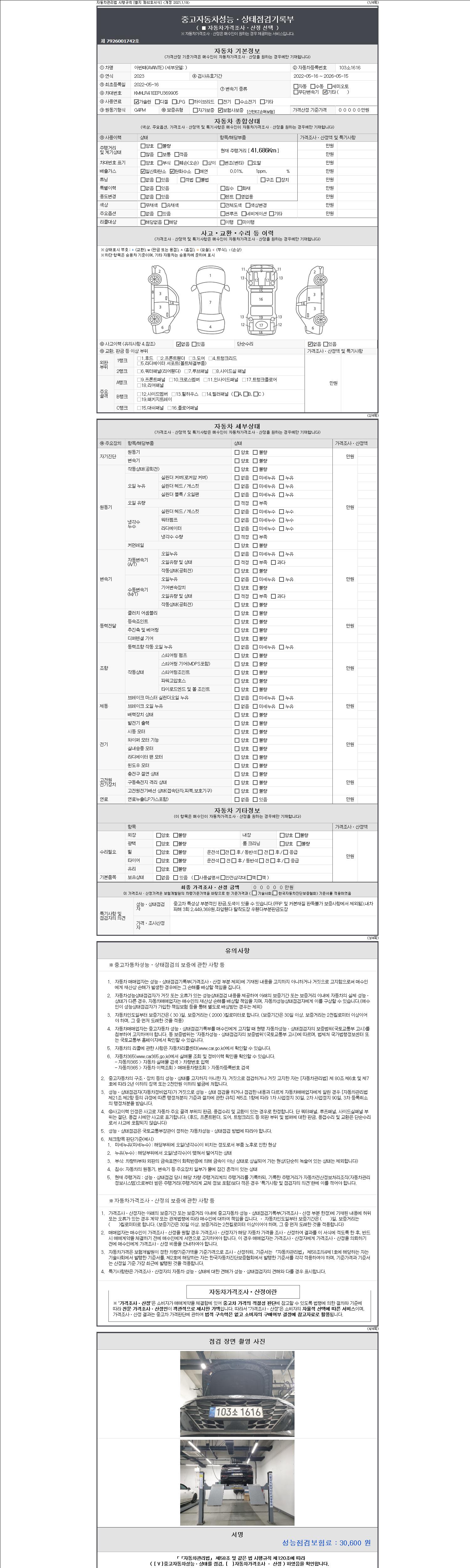 자동차관리법 시행규칙 제120조의 규정에 따라 별지 제 82호서식 《중고자동차 성능, 상태점검 기록부》를 발행한 성능, 상태점검자 및 매매자는 아래의 보증기간 또는 보증거리 이내의 중고자동차, 성능점검 기록부에 기재된 내용과 자동차의 실제 성능, 상태가 다른 경우 계약 또는 관계법령에 따라 매수인에 대하여 책임을 집니다.