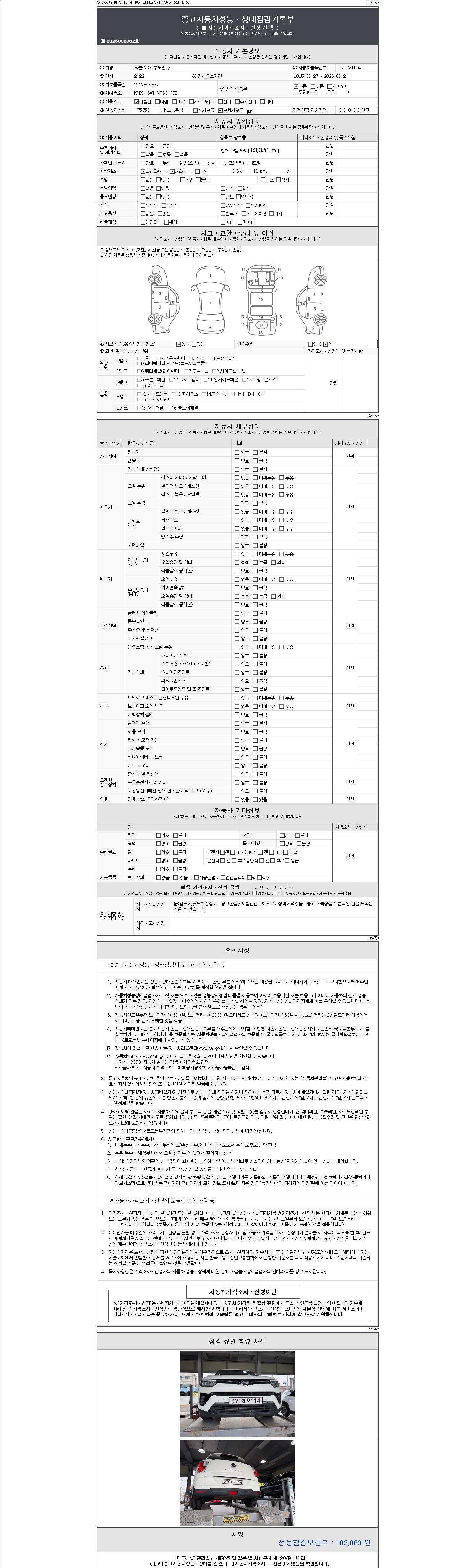 자동차관리법 시행규칙 제120조의 규정에 따라 별지 제 82호서식 《중고자동차 성능, 상태점검 기록부》를 발행한 성능, 상태점검자 및 매매자는 아래의 보증기간 또는 보증거리 이내의 중고자동차, 성능점검 기록부에 기재된 내용과 자동차의 실제 성능, 상태가 다른 경우 계약 또는 관계법령에 따라 매수인에 대하여 책임을 집니다.