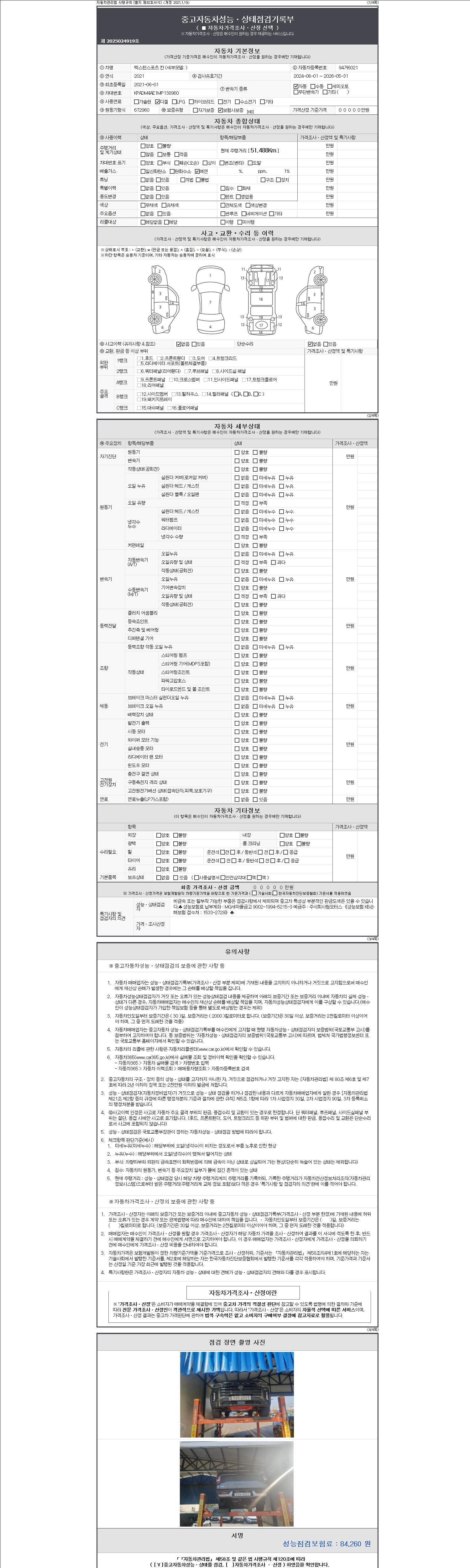자동차관리법 시행규칙 제120조의 규정에 따라 별지 제 82호서식 《중고자동차 성능, 상태점검 기록부》를 발행한 성능, 상태점검자 및 매매자는 아래의 보증기간 또는 보증거리 이내의 중고자동차, 성능점검 기록부에 기재된 내용과 자동차의 실제 성능, 상태가 다른 경우 계약 또는 관계법령에 따라 매수인에 대하여 책임을 집니다.