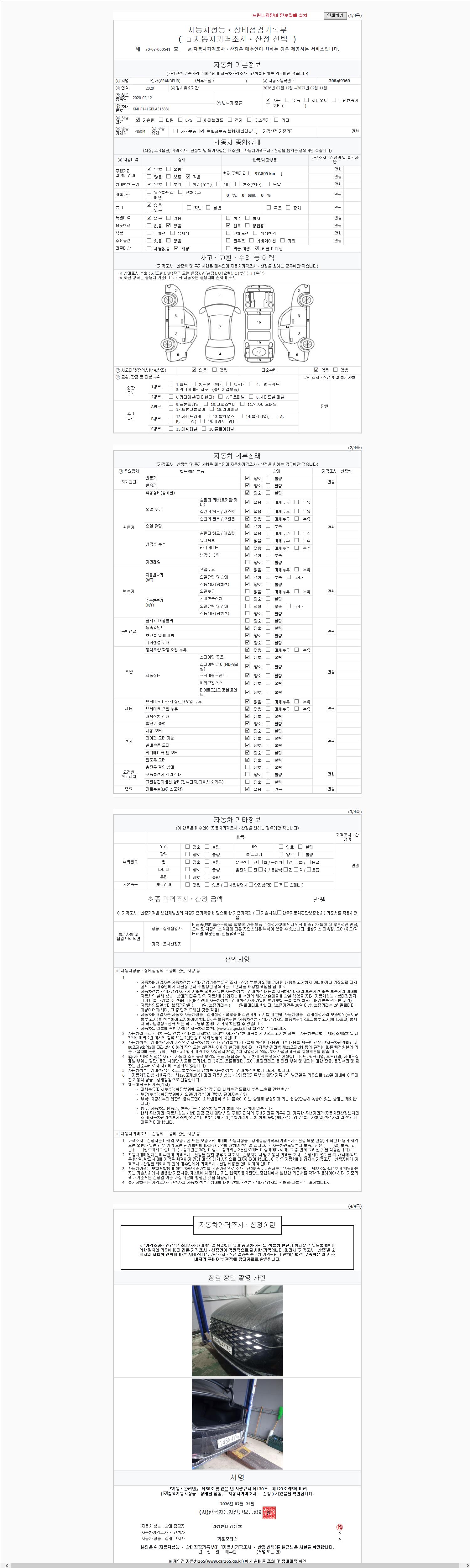 -중고자동차 매매업자를 통해 차량을 구입하실 경우 반드시 "중고자동차 성능, 상태점검 기록부"를 교뷰 받으셔야 하며, 매매업자는 반드시 의무 교부 하여야 압니다.