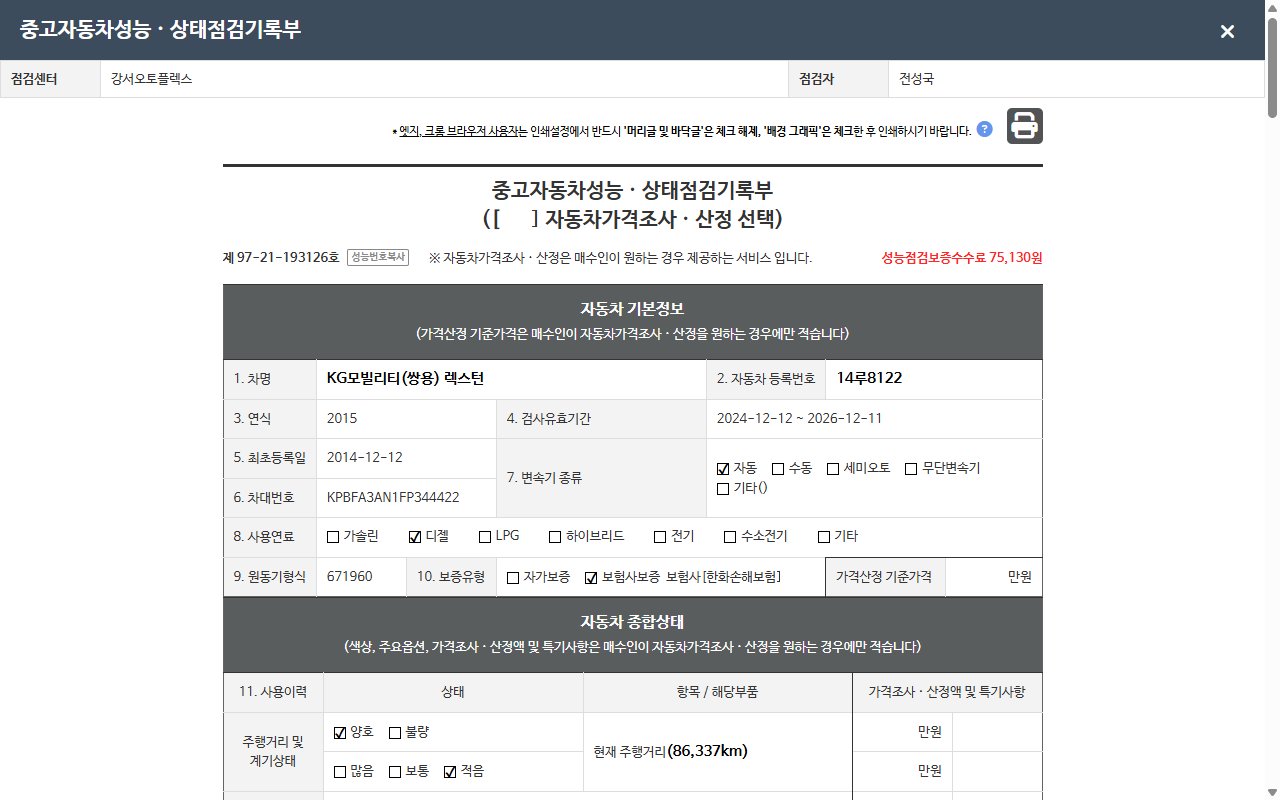 2. 차량 등록증이나 성능점검지 등을 상담자에게 요청및 확인하시고 사전에 미리 점검 하시기를 권유드립니다.