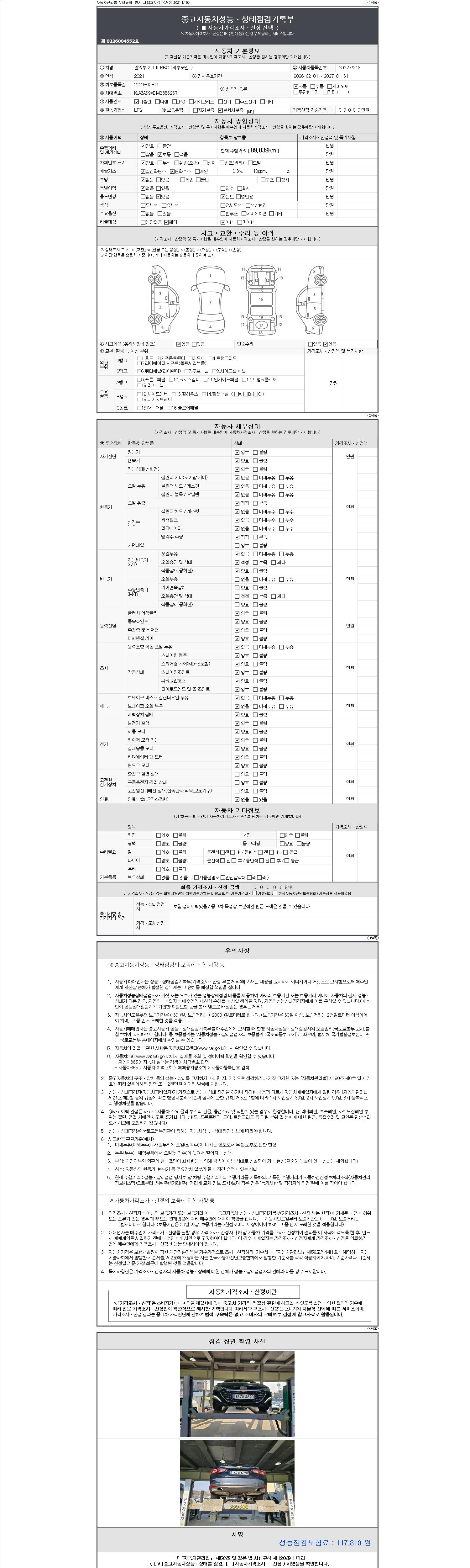 | 주행거리 | 89,039 km | 차량번호 | 393가2318 | 사고유무 | 성능기록부 참조 | 제시번호 | 제 2147483647 호 |