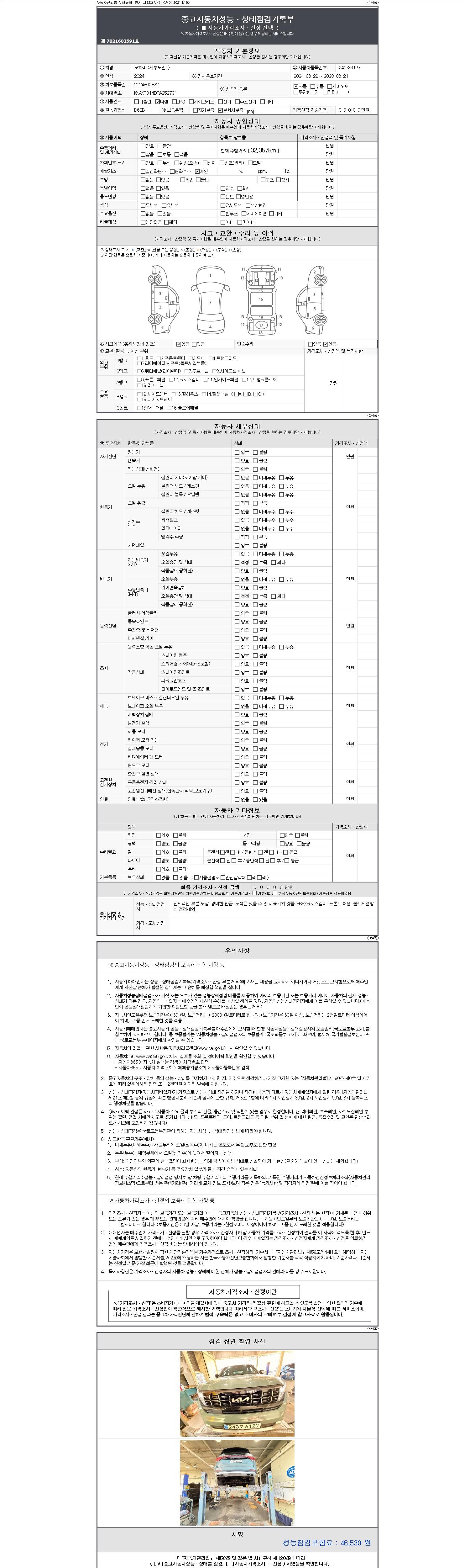 자동차관리법 시행규칙 제120조의 규정에 따라 별지 제 82호서식 《중고자동차 성능, 상태점검 기록부》를 발행한 성능, 상태점검자 및 매매자는 아래의 보증기간 또는 보증거리 이내의 중고자동차, 성능점검 기록부에 기재된 내용과 자동차의 실제 성능, 상태가 다른 경우 계약 또는 관계법령에 따라 매수인에 대하여 책임을 집니다.