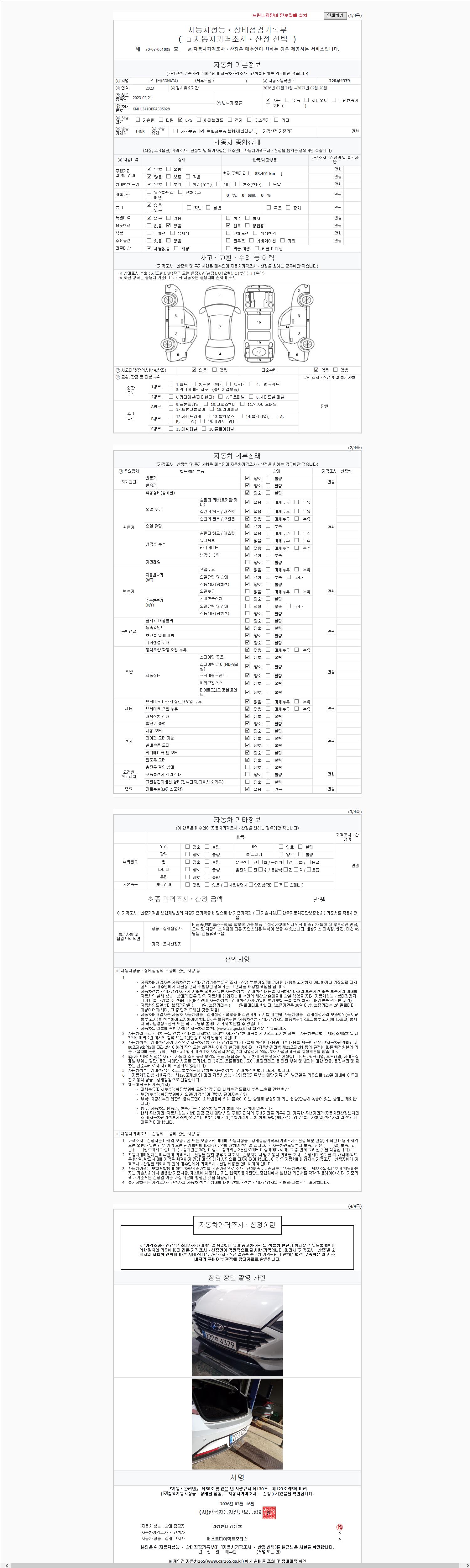 | 주행거리 | 83,401 km | 차량번호 | 220무4379 | 사고유무 | 성능기록부 참조 | 제시번호 | 제 2147483647 호 |