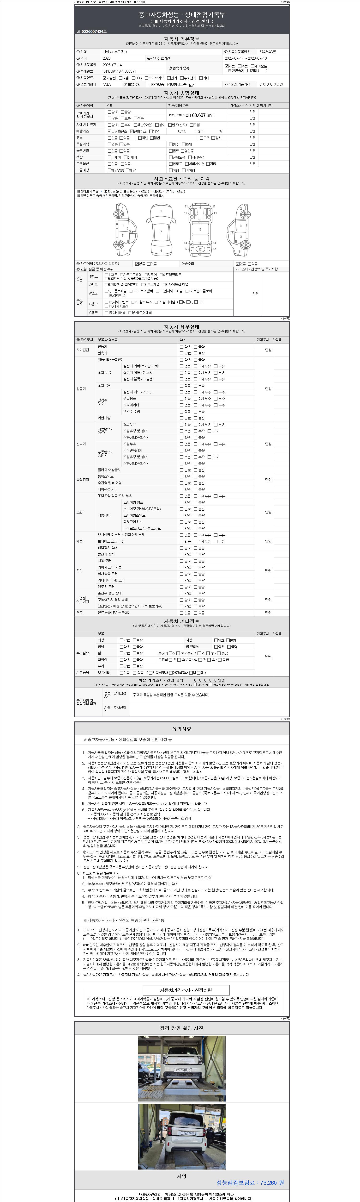 | 주행거리 | 68,687 km | 차량번호 | 374러4835 | 사고유무 | 성능기록부 참조 | 제시번호 | 제 2147483647 호 |